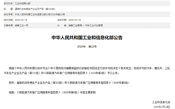 2020年5月18日,工信部官方网站发布了第332批《道路机动车辆生产企业及产品公告》。经企业准入条件考核,本批公告共批准新设立专用汽车生产企业4户。经装备中心最终审核,共有107户生产企业(其中汽车生产企业96户、摩托车生产企业11户)的187个产品(其中汽车产品173个、摩托车产品14个)符合国家有关规定和技术要求。依据同一型号判定原则归纳后,通过技术审查的产品共计171个(其中汽车产品159个、摩托车产品12个)。
