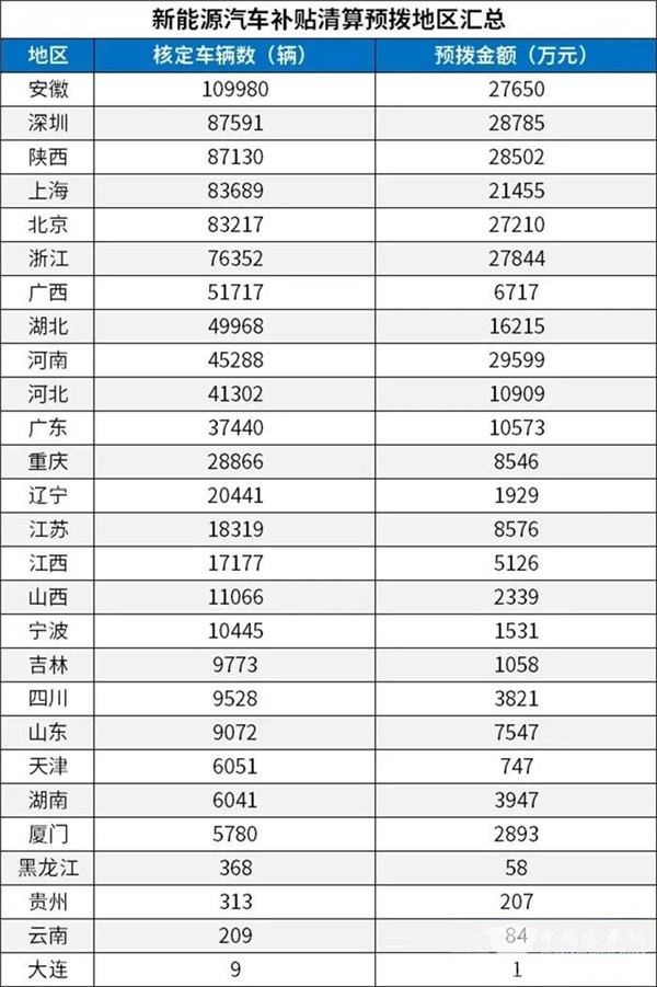 此次下达的2020年节能减排补助资金预算针对的就是此前完成销售上牌的新能源汽车,补贴预拨付文件显示,核定的车辆数为907132辆,本次拨付补贴资金28785万元。核定推广数量最多地区的是安徽,排名靠前的还有深圳、陕西、上海、北京,核定推广数量最多的企业是比亚迪,其次是北汽、吉利、江淮、上汽。