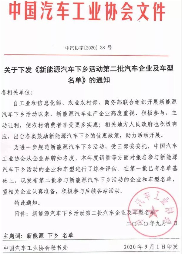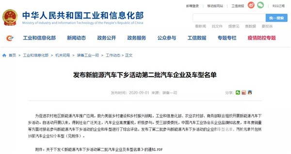 2020年9月1日,工业和信息化部装备工业一司发布《新能源汽车下乡活动第二批汽车企业及车型名单》。