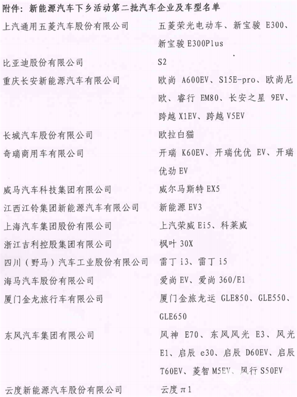 发布新能源汽车下乡活动第二批汽车企业及车型名单