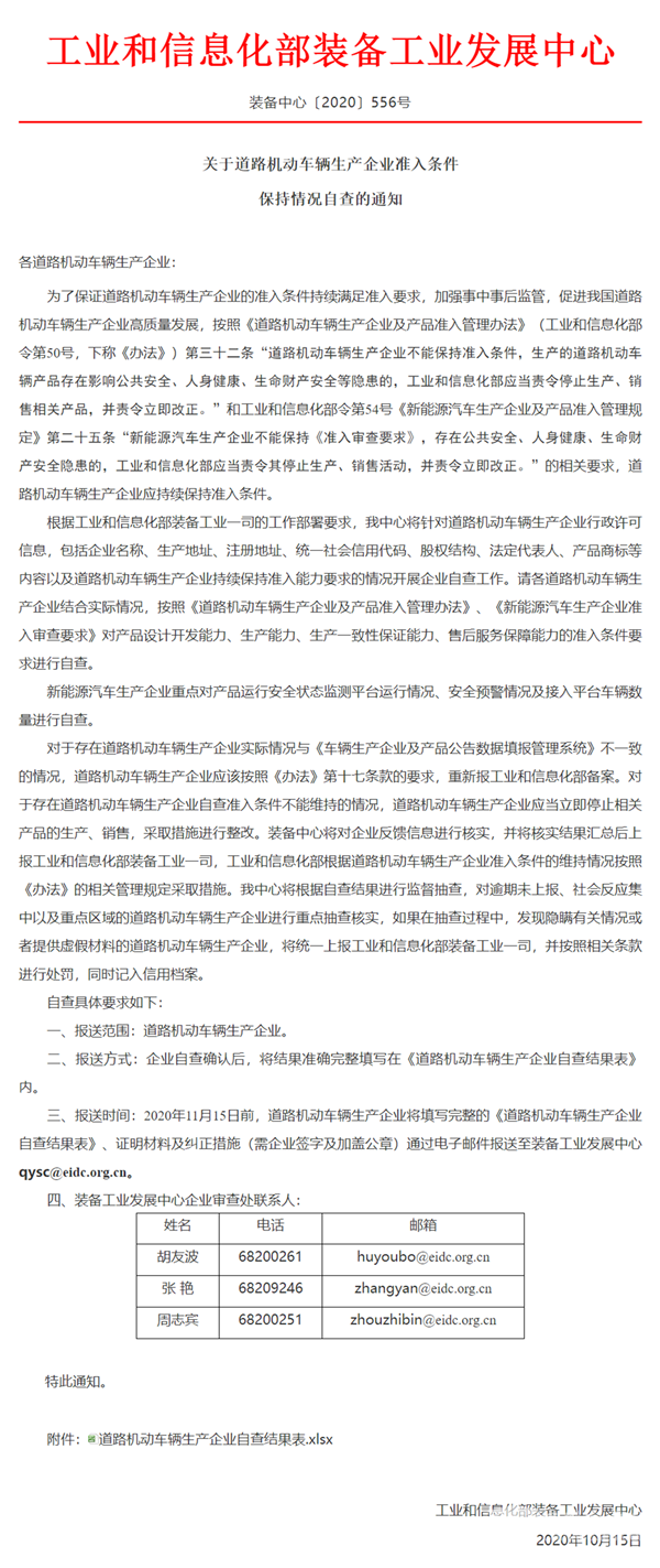 2020年10月15日,工业和信息化部装备工业发展中心发出《关于道路机动车辆生产企业准入条件保持情况自查的通知》(以下简称:《通知》),要求各道路机动车辆生产企业在2020年11月15日前进行“保持准入”自查并报送。