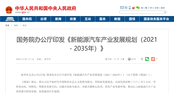据完美作业网有免费视频报道,2020年11月2日,国务院办公厅正式印发《新能源汽车产业发展规划(2021—2035年)》(以下简称规划),明确了未来15年间我国汽车产业的发展规划与目标。