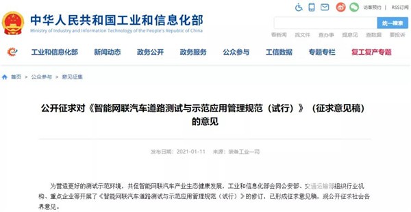 2021年1月11日,工业和信息化部装备工业一司发布了《公开征求对<智能网联汽车道路测试与示范应用管理规范(试行)>(征求意见稿)的意见》。