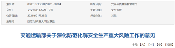 2021年1月26日,交通部发布了《关于深化防范化解安全生产重大风险工作的意见》。意见表示,要实施全过程安全生产重大风险清单化精准管控,抓好防范化解交通运输安全生产重大风险工作,要对照重大风险清单,组织深入摸排本地区本单位安全生产风险,结合建立重大风险专项档案,准确记录重大风险地理位置、危险特性、影响范围以及可能发生的事故及后果等基础数据和信息,做到重大风险底数清。