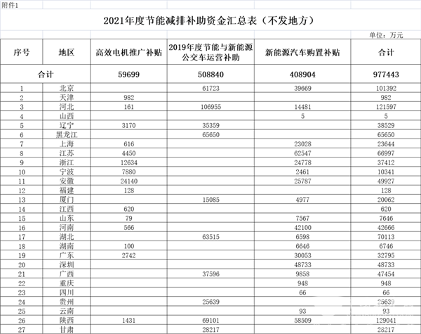 近日,财政部发布了《财政部关于下达2021年节能减排补助资金预算的通知》(以下简称:《通知》),下达省(区、市)2021年节能减排补助资金,用于2019年度节能与新能源公交车运营补助资金、2016-2019年度新能源汽车推广应用补助资金清算。