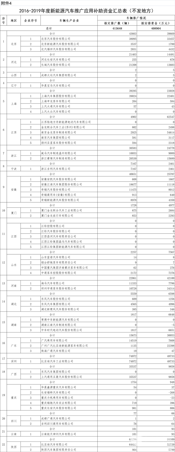 虽然本次财政部《通知》中新能源汽车推广应用补贴资金针对的是2016-2019年销售的新能源汽车,但对比今年3月份工信部发布的《2019年度新能源汽车推广应用补助资金清算审核信息表》来看,两份文件的金额相近,基本可以判定,财政部此次下达的资金主要是用于2019年度的新能源汽车补贴清算,只不过此前是工信部公示要清算的资金,而此次则是财政部要将资金通过地方发放到相关企业。