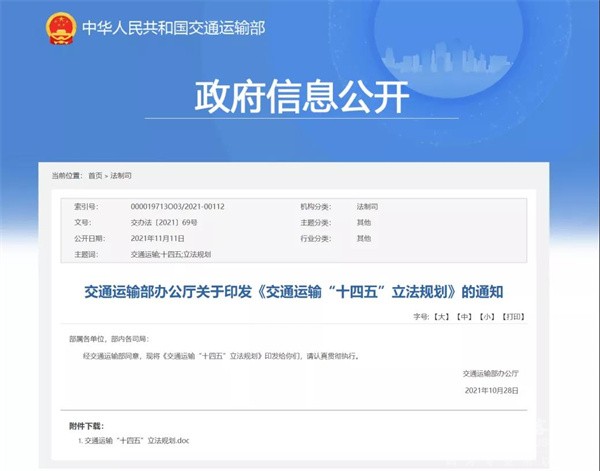 据完美作业网有免费视频了解到,2021年11月11日,交通运输部办公厅关于印发《交通运输“十四五”立法规划》(以下简称《规划》)的通知。
