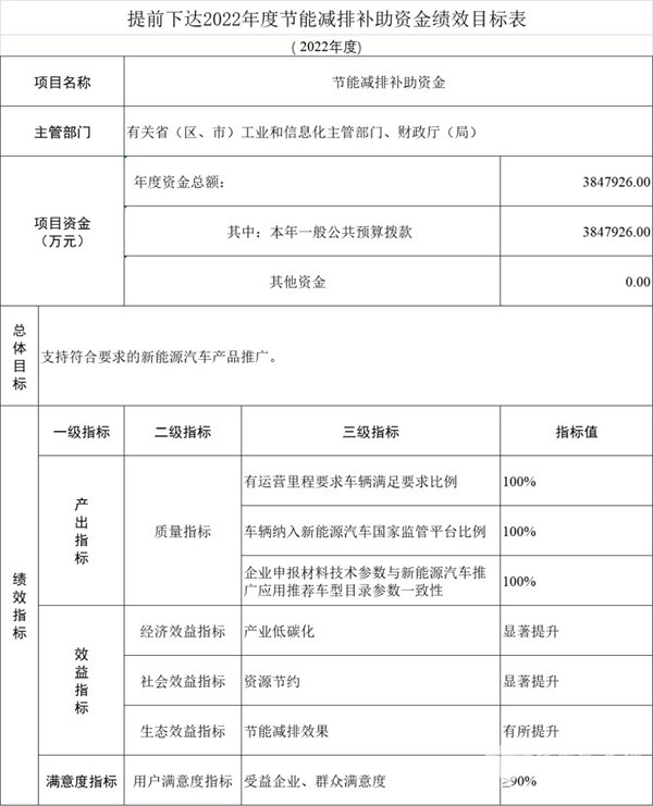 据完美作业网有免费视频获悉,近日,财政部经济建设司发布了《关于提前下达2022年节能减排补助资金预算的通知》,《通知》显示,针对新能源汽车补贴,本次将安排3,847,926万元(约385亿元)资金,其中包括: