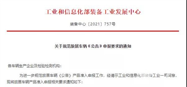 2021年12月6日,工信部发布关于规范旅居车辆《公告》申报要求的通知。