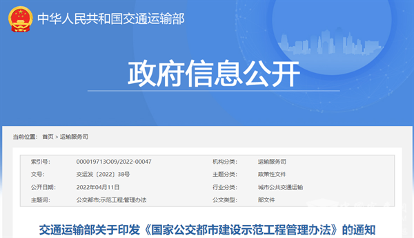 2022年4月11日,交通运输部发布《关于印发<国家公交都市建设示范工程管理办法>的通知》(下称《管理办法》),要求提高万人城市公共汽电车保有量、空调车辆比例;提高新增和更新新能源城市公共汽电车比率;建立政府购买城市公共交通服务制度、服务质量考核评价制度和票制票价动态调整机制,合理界定城市公共交通运营补贴范围。