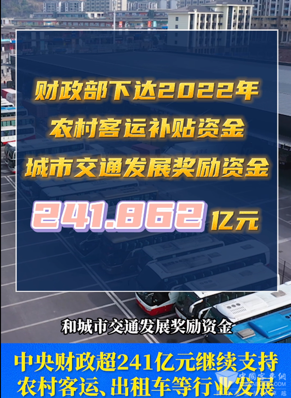 2022年4月18日,财政部发布消息称,将下达2022年农村客运补贴资金和城市交通发展奖励资金241.862亿元。其中农村客运补贴资金100.2906亿元,城市交通发展奖励资金141.5714亿元。