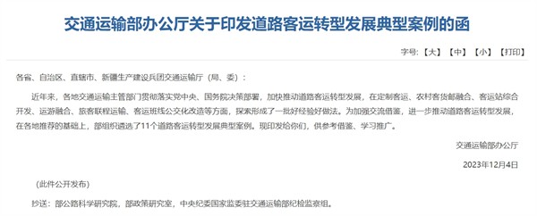 2023年12月11日,交通运输部在官网发布关于印发道路客运转型发展典型案例的函。文件显示,近年来,各地交通运输主管部门贯彻落实党中央、国务院决策部署,加快推动道路客运转型发展,在定制客运、农村客货邮融合、客运站综合开发、运游融合、旅客联程运输、客运班线公交化改造等方面,探索形成了一批好经验好做法。为加强交流借鉴,进一步推动道路客运转型发展,在各地推荐的基础上,部组织遴选了11个道路客运转型发展典型案例。