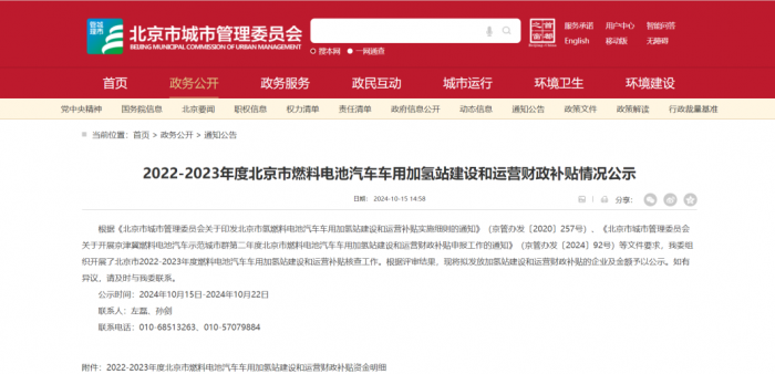 2024年10月15日,北京市城市管理委员会发布2022-2023年度北京市燃料电池汽车车用加氢站建设和运营财政补贴情况公示。