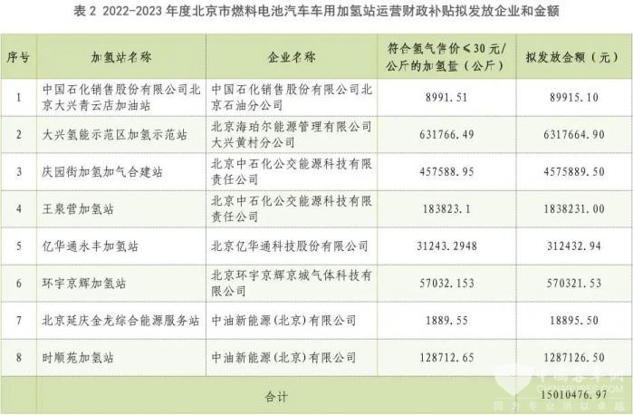 2022-2023年度北京市燃料电池汽车车用加氢站运营财政补贴拟发放企业为中国石化销售股份有限公司北京石油分公司、北京海珀尔能源管理有限公司大兴黄村分公司、北京中石化公交能源科技有限责任公司、北京亿华通科技股份有限公司、北京环宇京辉京城气体科技有限公司、中油新能源(北京)有限公司等6家企业的8个加氢站。补贴金额为15010476.97元。