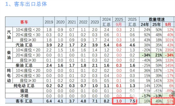 根据中国汽车流通协会提供的海关数据,2025年9月我国客车出口1.0万辆,同比增长51%;2025年1-9月我国客车累计出口7.5万辆,累计同比增长49%(见截图1)。