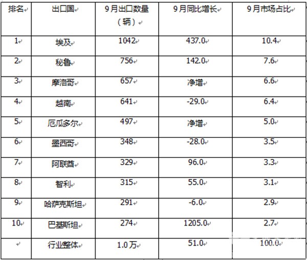 二、9月燃油客车出口国流向:埃及\秘鲁\摩洛哥居前三;TOP10同比7增3降,巴基斯坦增12倍领涨