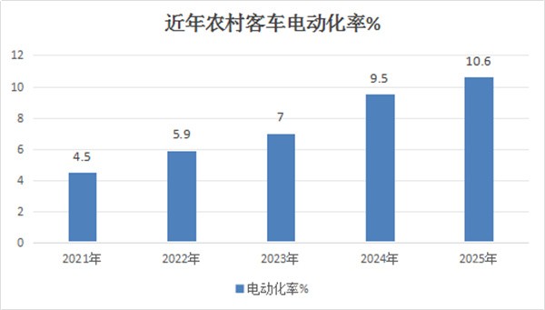 上表图可见,按动力种类划分,2025年前三季度国内农村客车电动化率达到10.6%,创下近5年以来新高。