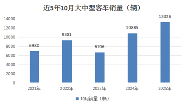 上图可见,2025年10月6米以上客车销量13326辆,创近5年同期最高,可见今年10月的大中客市场最好的年份,创近年最旺“银十“。 主要还是得益于今年以来老旧新能源公交客车“以旧换新”补贴政策的刺激及市场需求增加的驱动所致。
