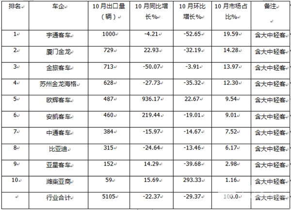- 10月客车出口:销5105辆 宇通夺冠 “三龙”紧跟 欧辉大涨