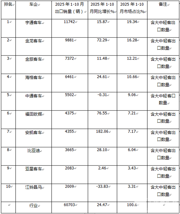 表2,根据中国客车统计信息网数据,2025年1-10月我国客车企业整体出口TOP10累计销量、同比统计:
