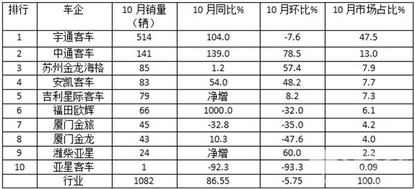 10月新能源座位客车:销1082辆 同比大涨环比小降 宇通强势霸榜