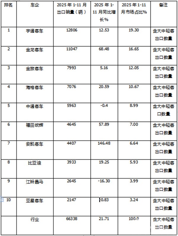 表1,根据中国客车统计信息网数据,2025年11月客车出口TOP10排行: