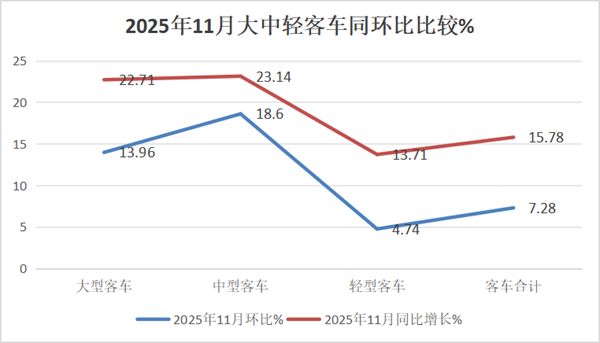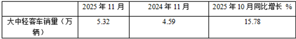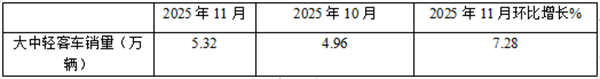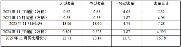 表1、2025年11月大中轻客车同比增长15.78%(数据来源:商用车专业委员会提供的批发信息):