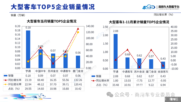 1、2025年11月及前11月大型客车销量TOP5排行: