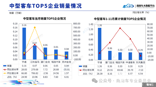 根据商用车专业委员会数据,2025年11月与1-11月我国大中轻客车销量TOP5排行如下: