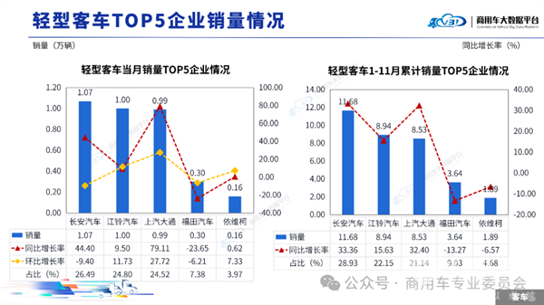 3、2025年11月及前11月轻型客车销量TOP5排行: