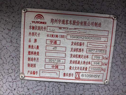 | 客车品牌 | 宇通客车 | 上牌时间 | 2017-09-20 |