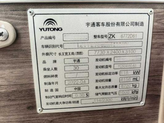 | 客车品牌 | 宇通客车 | 上牌时间 | 2022-05-13 |