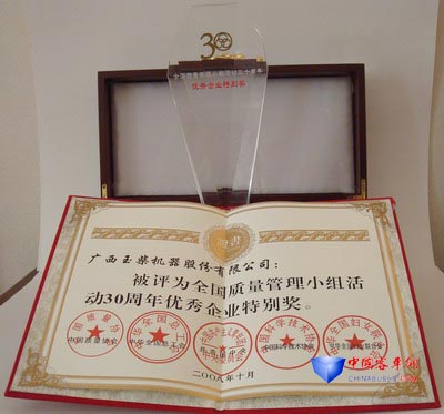 10月15日,在北京由中国质量协会等单位主办的全国质量管理小组活动30周年纪念大会上,玉柴股司荣获“全国质量管理小组活动30周年优秀企业特别奖”,成为广西唯一获得此项殊荣的企业。同时,总经理助理谭贵荣还荣获“全国质量管理小组活动30周年卓越领导者”,客服中心的呼叫中心QC小组也第一次以一个服务型的成果获得国优称号。