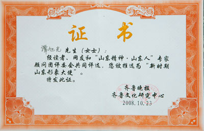 10月23日,“山东精神·山东人”大型报道活动暨“新时期山东形象大使”颁奖典礼在济南举行。谭旭光与张海迪、张瑞敏、季羡林等十人被评为“新时期山东形象大使”。