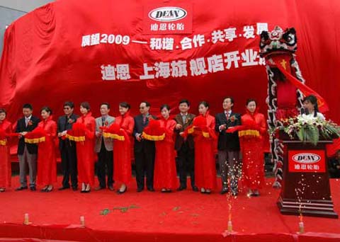 固铂轮胎中国区总经理辜思历先生(Alex Koi)(左四)在迪恩品牌卡客车轮胎旗舰店开业剪彩现场