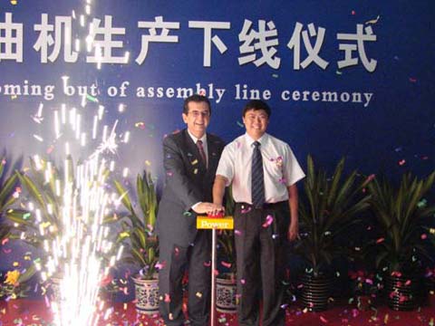 2007年8月16日,引进美国最新技术生产的NGD3.0柴油机成功下线。图为朝柴总经理赵庄与美国万国公司总裁尚伟德共同启动下线点火按钮