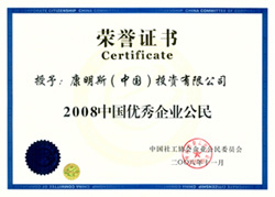 2008年11月16日-第四届中国企业公民论坛暨表彰大会在北京人民大会堂隆重举行,康明斯(中国)投资有限公司与包括英特尔、可口可乐、日立和联想在内的49家跨国公司和本土企业一起入选“2008中国优秀企业公民”榜单。