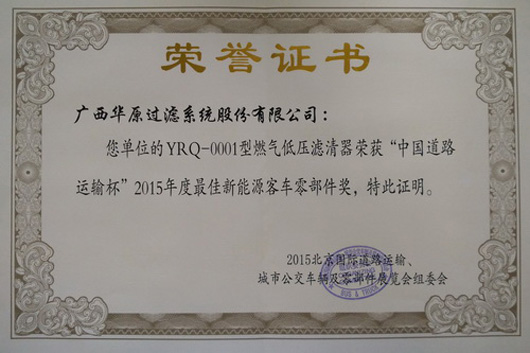 为期三天的2015北京国际道路运输、城市公交车辆及零部件展览会于2015年5月13日在北京国家会议中心落下帷幕。华原公司作为一家具备自主研发和完备检测能力的滤清器龙头企业,精心组织了满足国4以上发动机需求的产品参展,其中,参展产品经专业评委的筛选和现场评审,公司燃气低压滤清器YRQ-0001和空气滤芯YK3046D分别获评为“2015年度最佳新能源客车零部件奖”和“”。