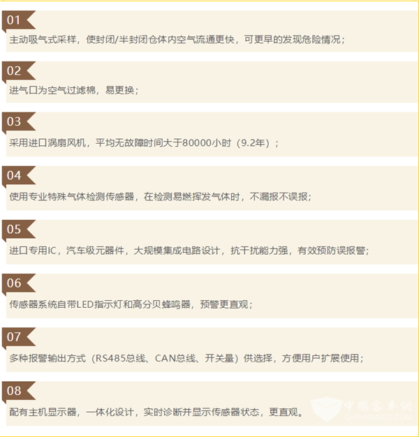 显示器显示车厢内各监测模块的安装位置与工作状态,并且可显示对应监测区域的报警级别,分LCD或OLED显示,具备CAN通讯和485通讯模块,可将报警信号上传至公交调度系统管理后台。
