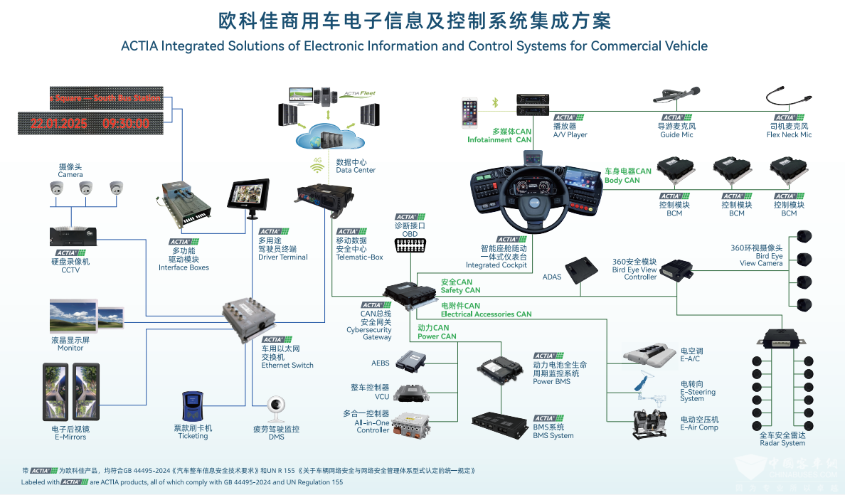通过高度集成的模块化设计,实现车辆动力控制、信息娱乐、安全监控等多系统无缝对接,极大提升商用车辆的安全性,能效与智能化水平;可集成整合各类各品牌的客车电子、信息及控制设备,形成车辆运行网络(CAN总线)和车辆运营网络、CAN总线安全网关、动力电池全生命周期监控系统、数据分发管理及数据遥测四大创新,确保网络和数据的保密与安全,降低车辆运营成本。