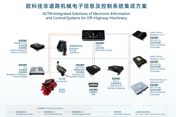面向农用机械、工程机械等非道路应用场景,欧科佳提供全面完整、高度集成、应用灵活的包括整车电控系统、智能诊断和能源管理在内的电子控制集成解决方案,包含三大系统(电子系统、信息系统、液压控制系统)、四大网络(液压控制CAN、机载电器CAN、数据管理CAN、以太网通讯);旨在帮助非道路机械设备制造商提升产品性能与环保标准,积极支持非道路国四排放及电动化趋势。