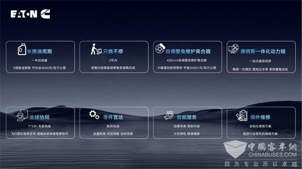 在服务价值体验层面,伊顿康明斯中国始终以“帮大家少花钱、少费心、多跑车”为目标。变速箱换油周期长达5年/60万公里,离合器自调整免维护,显著降低使用成本。公司提供2年不限里程质保,箱内故障执行“只换不修",有效减少停工时间。7x24小时专家热线与飞行服务提供快速响应,同时通过远程监测提前预判风险,实现从“被动修"到“主动防”的转变。长换油周期帮助用户每百万公里节省约一半换油成本,配合计划维修与零件快速调拨,全程保障车辆高出勤与收益稳定。
