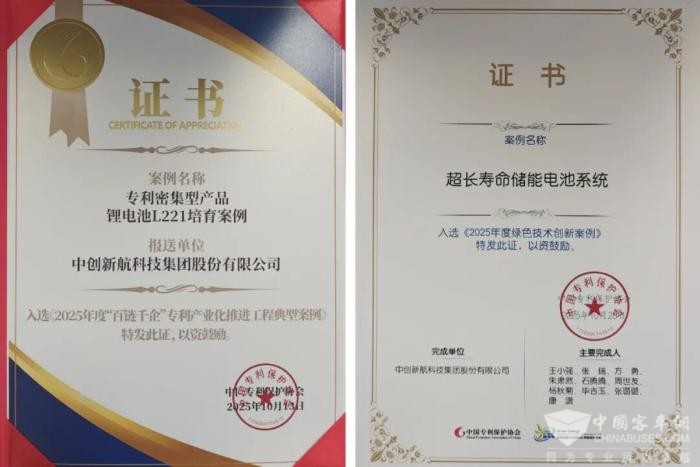 本次会议上,中创新航凭借领先的技术实力与高质量知识产权成果,荣获两项殊荣。其中,公司“专利密集型产品锂电池L221培育案例”成功入选全国二十个“百链千企”专利产业化推进工程典型案例。该名单涵盖中国移动、南方电网、中石化、三峡集团等大型央企与行业龙头,彰显了中创新航在知识产权布局与产业化应用方面的标杆地位。同时,中创新航“超长寿命储能电池系统”获评“2025年度绿色技术创新案例”,进一步体现了公司在绿色科技领域的创新引领能力。