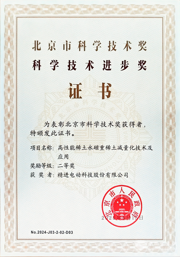 北京市于2025年11月举办2024年度科学技术奖励表彰大会,精进电动与项目团队一起,在“高性能稀土永磁重稀土减量化技术及应用”项目中的创新得到充分认可,荣获科技进步二等奖。