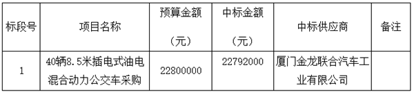 温州德臻招标代理有限公司就温州市交通运输集团有限公司40辆8.5米插电式油电混合动力公交车采购项目进行公开招标方式国有企业采购(项目编号:WZDZCG-20190517Z),本项目于2019年5月17日发布招标公告,2019年6月6日于温州市行政审批与公共资源交易服务管理中心12号评标室进行评审,经评标委员会综合评定,确定此次中标供应商为:
