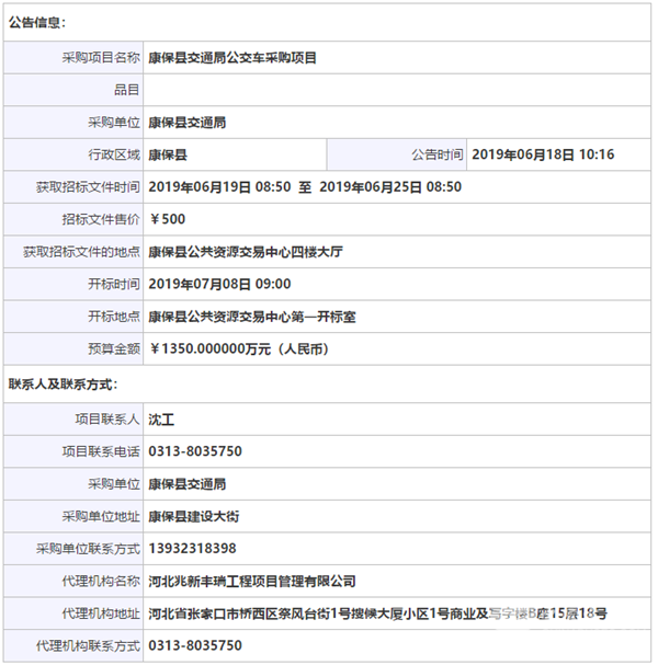 河北省张家口市康保县交通局公交车采购项目公开招标公告