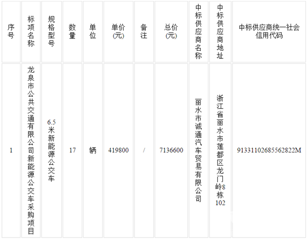 浙江省龙泉市公共交通有限公司新能源公交车采购项目中标公告