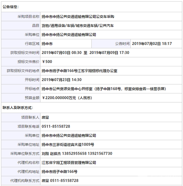 江苏省扬中市中扬公共交通运输有限公司公交车采购公开招标公告