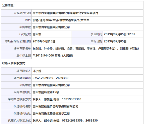 广东省惠州市汽车运输集团有限公司纯电动公交车采购项目中标公告