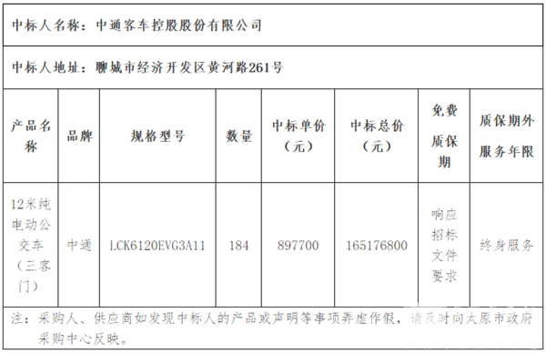 山西省太原公共交通控股有限公司纯电动公交车公开招标采购中标公告